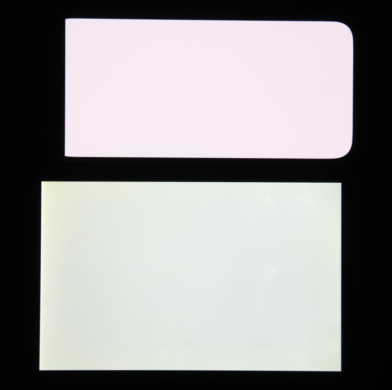 Экран характеризуется великолепными углами обзора. Яркость под углом у обоих экранов заметно уменьшается, но в случае смартфона падение яркости выражено гораздо меньше. В итоге при формально одинаковой яркости экран этого смартфона визуально выглядит гораздо более ярким (в сравнении с ЖК-экранами), так как на экран мобильного устройства часто приходится смотреть как минимум под небольшим углом. Правда, белый цвет при отклонении на очень большие углы приобретает едва заметный сине-зеленый оттенок. Черный цвет остается просто черным под любыми углами. Он настолько черный, что параметр контрастности в данном случае неприменим. Для сравнения приведем фотографии, на которых на экраны смартфона и второго участника сравнения выведены одинаковые изображения, при этом яркость экранов изначально установлена примерно на 200 кд/м², а цветовой баланс на фотоаппарате принудительно переключен на 6500 К.