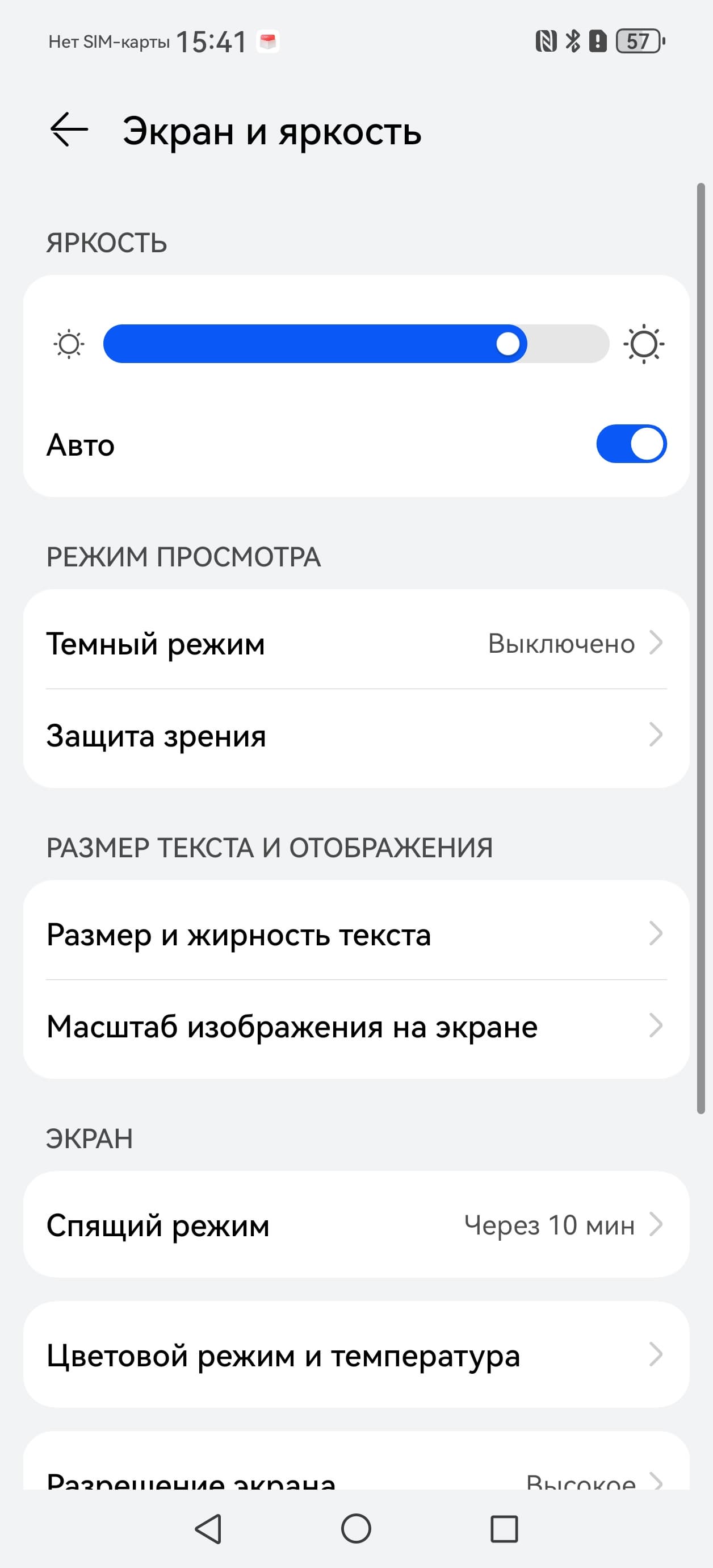 При выводе белого поля во весь экран и при ручном управлении яркостью ее максимальное значение составило 580 кд/м² в обычных условиях, а на очень ярком свету оно может повышаться до 1500 кд/м² (по крайней мере, на какое-то время и если смартфон не нагрелся). В режиме HDR — до 1200 кд/м². Максимальная яркость очень высокая. В данном случае чем меньше площадь белого на экране, тем он светлее, то есть фактическая максимальная яркость белых участков будет почти всегда выше указанных значений. В итоге, учитывая отличные антибликовые свойства, читаемость экрана днем на солнце должна быть на хорошем уровне. Минимальное значение яркости 1,3 кд/м², пониженный уровень яркости без проблем позволяет использовать устройство даже в полной темноте. Работает автоматическая регулировка яркости по датчику освещенности (он расположен под экраном в верхней части ближе к правому краю по горизонтали). Работа этой функции зависит от положения ползунка регулировки яркости: им пользователь может попытаться выставить желаемый уровень яркости в текущих условиях. Если оставить все по умолчанию, то в полной темноте функция автояркости уменьшает яркость до 4 кд/м² (очень темно), в условиях освещенного искусственным светом офиса (примерно 550 лк) устанавливает на 130 кд/м² (нормально), в очень ярком окружении (условно соответствует нахождению на прямом солнечном свету) повышает до 1000 кд/м² (достаточно). Результат нас не совсем устроил, поэтому мы в полной темноте чуть увеличили яркость, получив для трех условий, указанных выше, следующие значения: 13, 130 и 1000 кд/м² (что и было нужно). Получается, что функция автоподстройки яркости работает адекватно и в какой-то степени позволяет пользователю настраивать свою работу под индивидуальные требования.