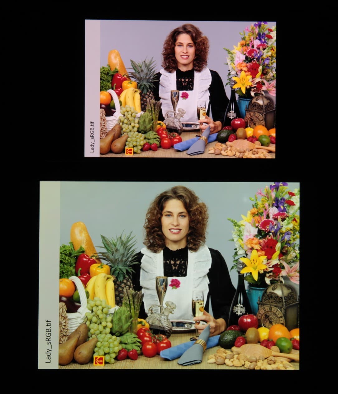 В этом устройстве есть возможность скорректировать цветовой баланс с помощью выбора профиля цветовой температуры или регулировки оттенка на цветовом круге. Впрочем, в случае профиля Обычные цвета даже без коррекции баланс оттенков на шкале серого хороший, так как цветовая температура достаточно близка к стандартным 6500 К, а отклонение от спектра абсолютно черного тела (ΔE) ниже 10, что для потребительского устройства считается хорошим показателем. При этом цветовая температура и ΔE мало изменяются от оттенка к оттенку — это положительно сказывается на визуальной оценке цветового баланса. (Самые темные области шкалы серого можно не учитывать, так как там баланс цветов не имеет большого значения, да и погрешность измерений цветовых характеристик на низкой яркости большая.)