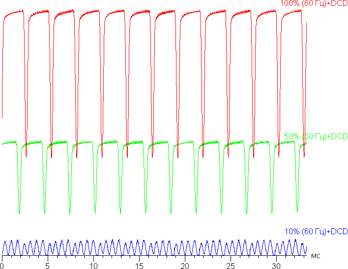 В англоязычной литературе и в новостях обычно используют название DC Dimming (на графиках сократим до DCD). При включении этой функции меняется только характер модуляции на низкой яркости. Видимого мерцания как не было, так и нет. Приведем графики для режима с частотой обновления 60 Гц: