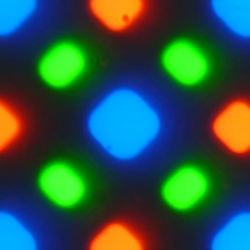 В этом экране используется матрица AMOLED — активная матрица на органических светодиодах. Полноцветное изображение создается с помощью субпикселей трех цветов — красного (R), зеленого (G) и синего (B), но красных и синих субпикселей в два раза меньше, что можно обозначить как RGBG. Это подтверждается фрагментом микрофотографии: