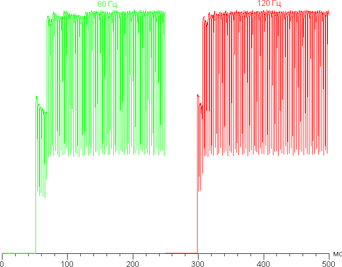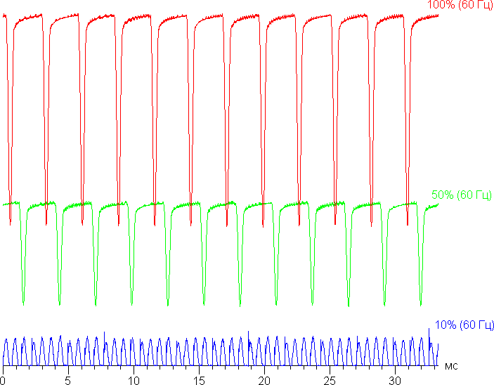 На высоком и среднем уровне яркости присутствует значимая модуляция с частотой 360 Гц. На рисунках ниже приведены зависимости яркости (вертикальная ось) от времени (горизонтальная ось) для нескольких значений настройки яркости (режим с частотой обновления 60 Гц):