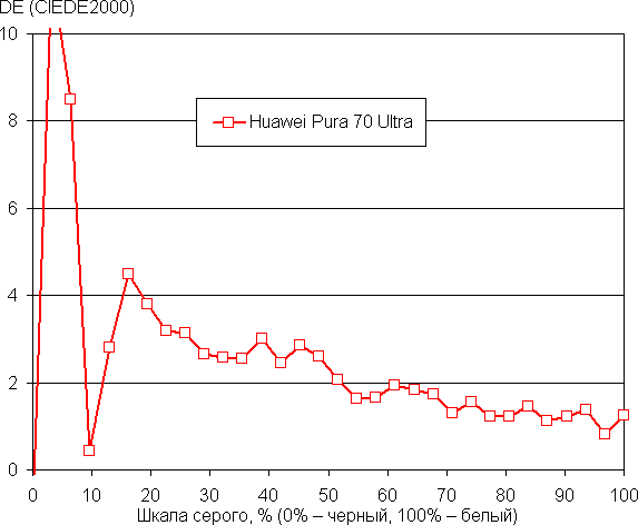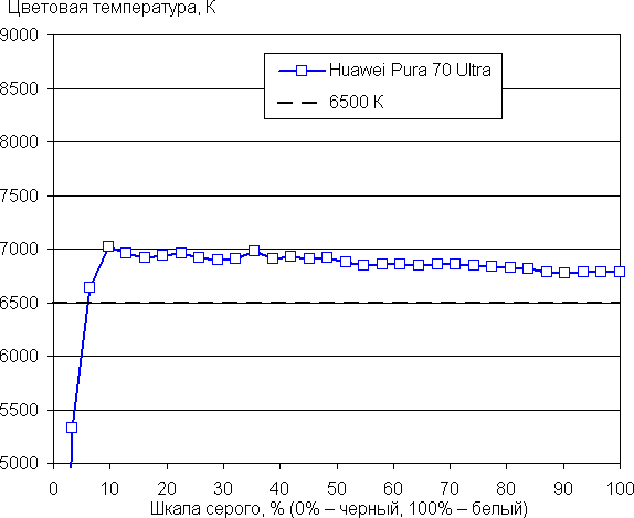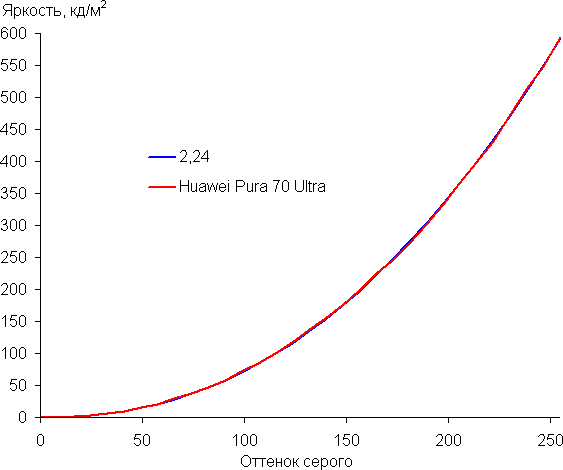 Напомним, что в случае OLED-экранов яркость фрагментов изображения динамично меняется в соответствии с характером выводимого изображения — чуть уменьшается для светлых в целом изображений. В итоге полученная зависимость яркости от оттенка (гамма-кривая), скорее всего, не соответствует гамма-кривой статичного изображения, так как измерения проводились при последовательном выводе оттенков серого почти на весь экран.