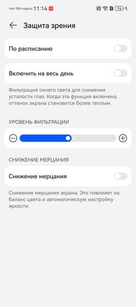 Разумеется есть функция снижения интенсивности синей компоненты. В описании режима Защита зрения приведена дезинформация про усталость глаз. В принципе, яркий свет может приводить к нарушению суточного (циркадного) ритма (см. статью про iPad Pro с дисплеем 9,7 дюйма), но всё решается снижением яркости до низкого, но еще комфортного уровня, а искажать цветовой баланс, уменьшая вклад синего, нет абсолютно никакого смысла.
