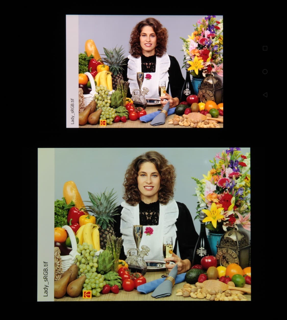 Цветопередача хорошая, цвета в меру насыщенные, цветовой баланс у экранов немного различается. Напомним, что фотография не может служить надежным источником сведений о качестве цветопередачи и приводится только для условной наглядной иллюстрации. В частности, выраженный красноватый оттенок белого и серого полей, присутствующий на фотографиях экрана смартфона, при перпендикулярном взгляде визуально отсутствует, что подтверждается аппаратными тестами с помощью спектрофотометра. Причина в том, что спектральная чувствительность матрицы фотоаппарата неточно совпадает с этой характеристикой человеческого зрения.
