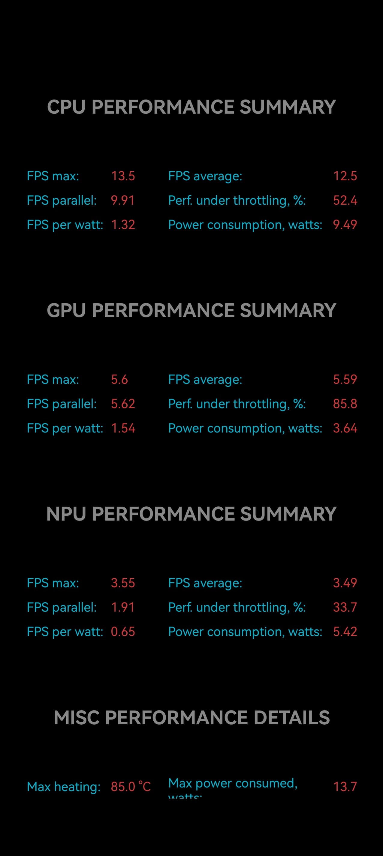 Тест на снижение производительности при нагреве мы проводим с помощью программы Burnout Benchmark, которая позволяет нагружать CPU, GPU и NPU. Сначала результаты теста в обычном режиме: