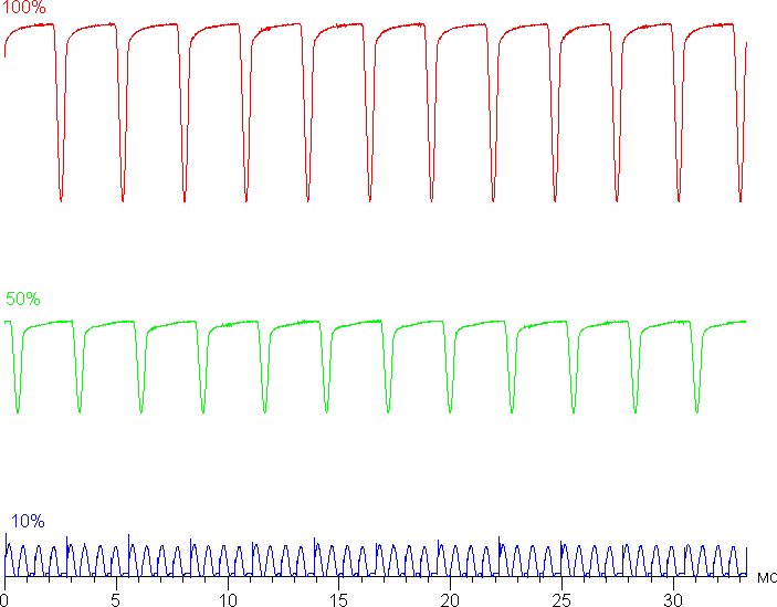 На высоком и среднем уровне яркости присутствует значимая модуляция с частотой 360 Гц. На рисунках ниже приведены зависимости яркости (вертикальная ось) от времени (горизонтальная ось) для нескольких значений настройки яркости: