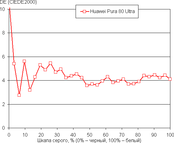 Напомним, что в случае OLED-экранов яркость фрагментов изображения динамично меняется в соответствии с характером выводимого изображения — чуть уменьшается для светлых в целом изображений. В итоге полученная зависимость яркости от оттенка (гамма-кривая), скорее всего, не соответствует гамма-кривой статичного изображения, так как измерения проводились при последовательном выводе оттенков серого почти на весь экран.