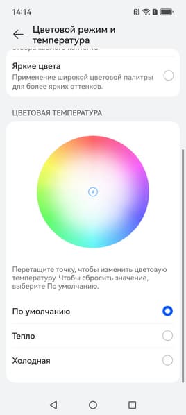 В этом устройстве есть возможность скорректировать цветовой баланс с помощью выбора профиля цветовой температуры или регулировки оттенка на цветовом круге.