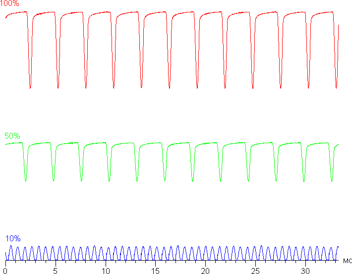 На высоком и среднем уровне яркости присутствует значимая модуляция с частотой 360 Гц. На рисунках ниже приведены зависимости яркости (вертикальная ось) от времени (горизонтальная ось) для нескольких значений настройки яркости: