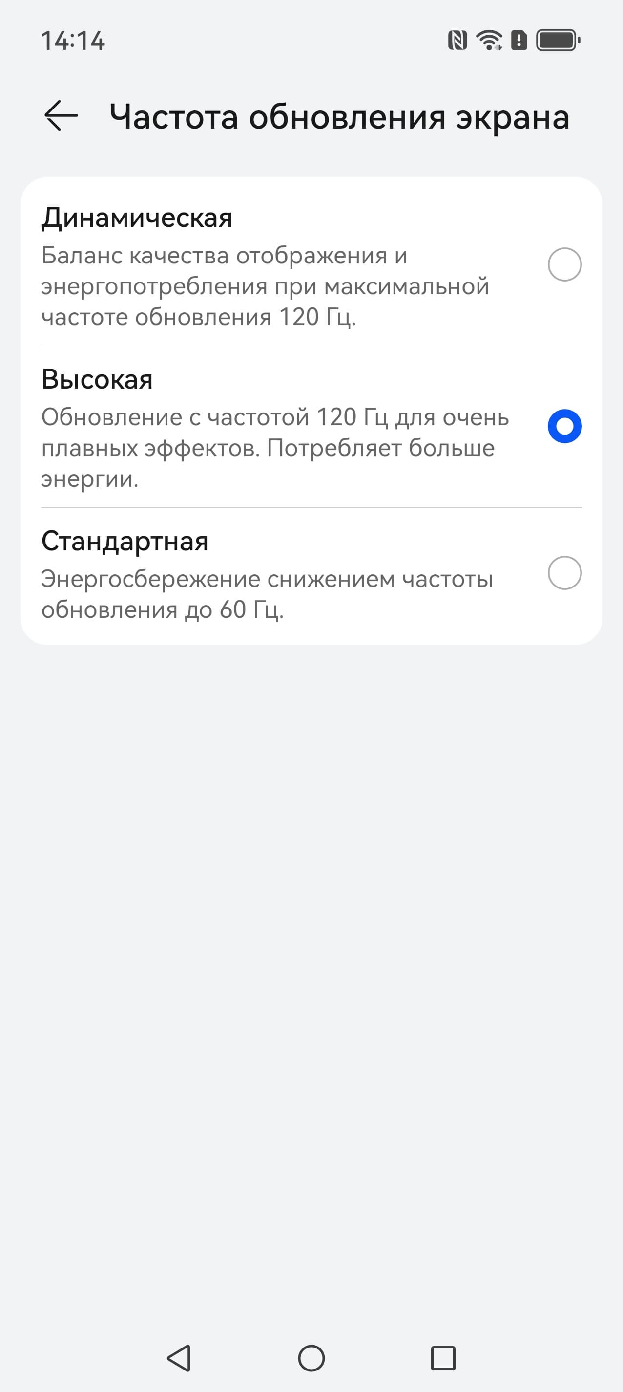 В этом режиме плавность прокрутки (списков в меню и т. д.) повышается. Характер модуляции при этом не меняется. По факту режим всегда динамичный, и на статичных изображениях, если не касаться экрана, частота обновления может снижаться до 10 Гц (а может и ниже). Данной настройкой пользователь ограничивает только максимальную частоту обновления.
