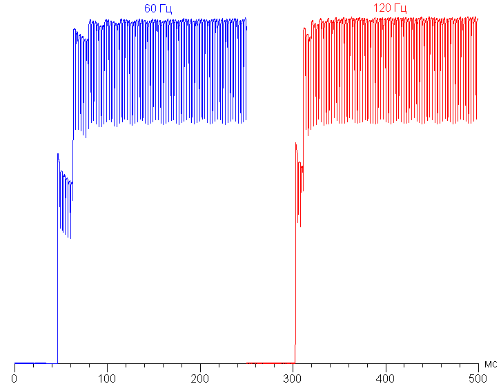 Переключение состояния элементов матрицы выполняется практически мгновенно, но на фронте включения может присутствовать ступенька шириной примерно 17 мс (что соответствует частоте обновления экрана примерно в 60 Гц) или примерно 8 мс (120 Гц). Например, так выглядит зависимость яркости от времени при переходе от черного к белому: