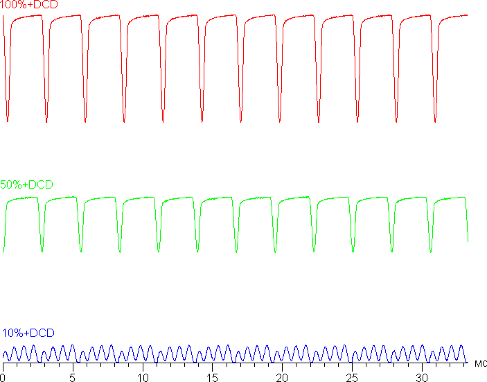 В англоязычной литературе и в новостях обычно используют название DC Dimming (на графиках сократим до DCD). При включении этой функции меняется только характер модуляции на низкой яркости. Видимого мерцания как не было, так и нет. Приведем графики: