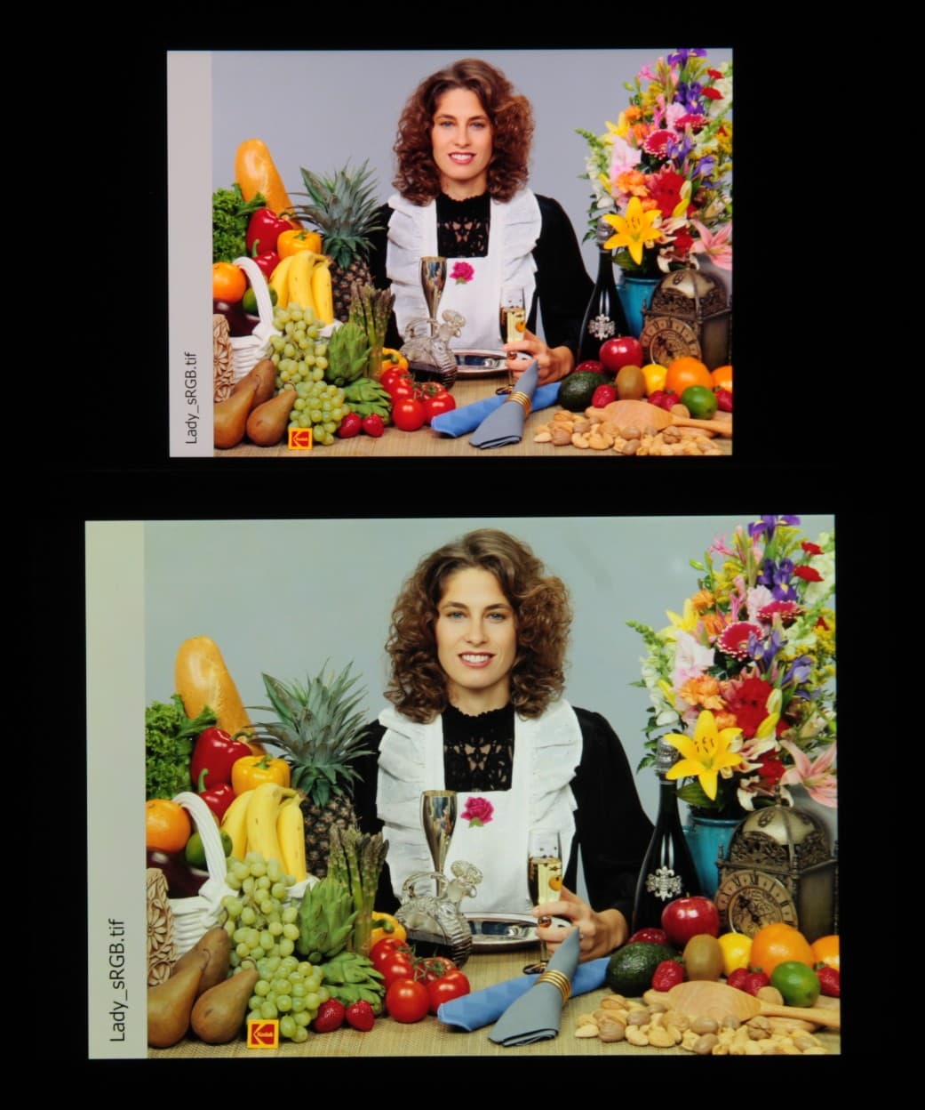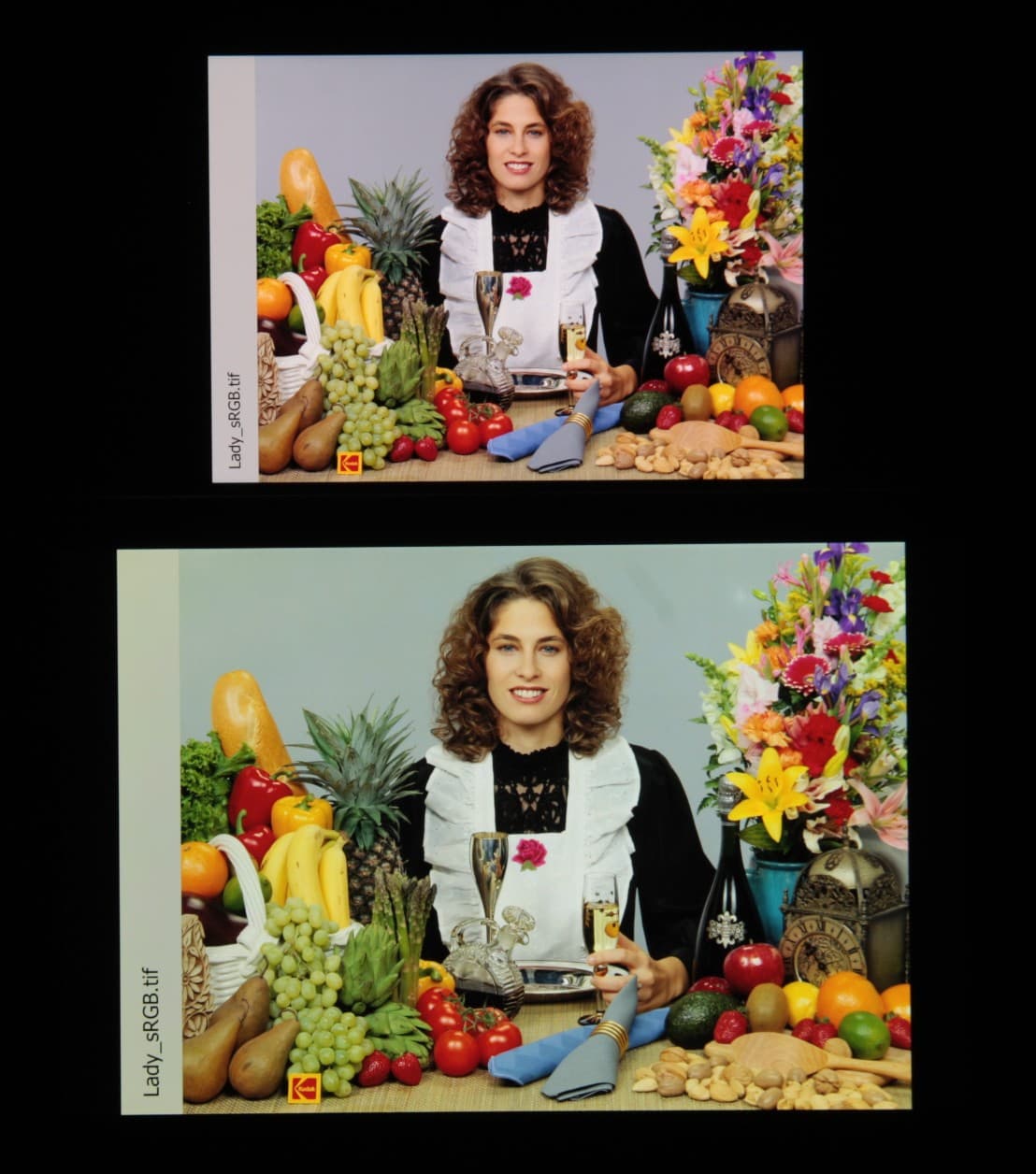 Отметим, что на экранах с уширенным цветовым охватом (без соответствующей коррекции) цвета́ обычных изображений, оптимизированных для устройств sRGB, выглядят неестественно насыщенными. Отсюда и рекомендация: в большинстве случаев смотреть кино, фотографии и все естественное лучше при выборе профиля Обычные цвета. При этом, если в изображении прописан отличный от sRGB профиль, то смотреть его лучше с использованием штатной программы Галерея.