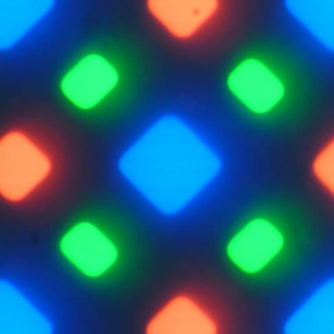 В этом экране используется матрица AMOLED — активная матрица на органических светодиодах. Полноцветное изображение создается с помощью субпикселей трех цветов — красного (R), зеленого (G) и синего (B), но красных и синих субпикселей в два раза меньше, что можно обозначить как RGBG. Это подтверждается фрагментом микрофотографии: