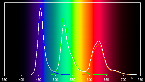 Спектры типичны для OLED — области первичных цветов хорошо разделены и имеют вид относительно узких пиков, перекрестное подмешивание цветов практически отсутствует: