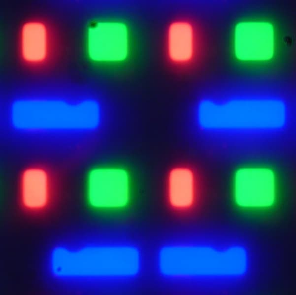 В этом экране используется OLED-матрица — активная матрица на органических светодиодах. Полноцветное изображение создается с помощью субпикселей трех цветов — красного (R), зеленого (G) и синего (B) в равном количестве, что подтверждается фрагментом микрофотографии: