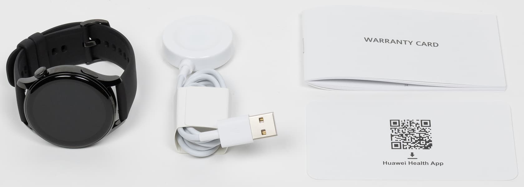 Комплектация, впрочем, скромная. Кроме самого устройства это только гарантийный буклет, карточка с QR-кодом для загрузки приложения Huawei Health и беспроводная зарядка с USB-А на конце провода.