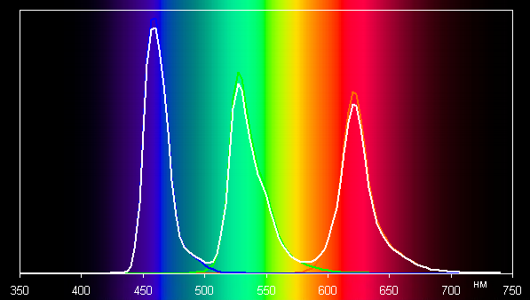 Спектры типичны для OLED — области первичных цветов хорошо разделены и имеют вид относительно узких пиков, перекрестное подмешивание цветов практически отсутствует: