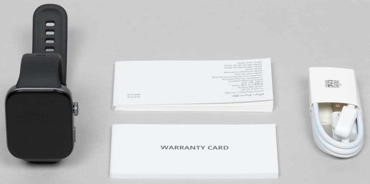 Комплектация стандартно-минимальная: помимо самих часов с силиконовым ремешком — только буклеты с гарантийными условиями и советами по подключению к смартфону, а также зарядный кабель, на одном конце которого магнитный блок с двумя контактами, а на другой — штекер USB-A. Увы, беспроводную зарядку устройство не поддерживает.