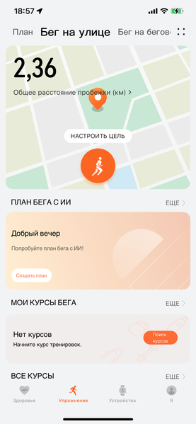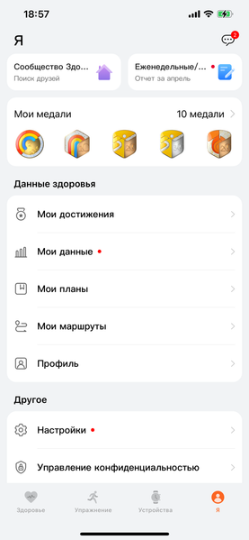 Наконец, разделы «Упражнение» и «Я» в повседневном использовании вам вряд ли понадобятся, так как в первом случае вы просто получаете доступ к нескольким основным тренировкам (с тем же успехом их можно запустить и через часы), а во втором — к ранее заполненным сведениям о себе. Правда, в «Упражнениях» есть курсы бега, так что если вы ориентированы именно на этот вид спорта, вам туда. А в «Я» можно посмотреть свои медали и сводные отчеты за неделю и месяц.