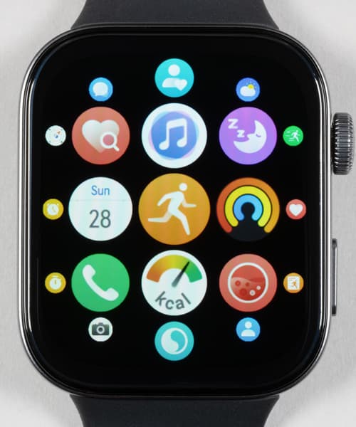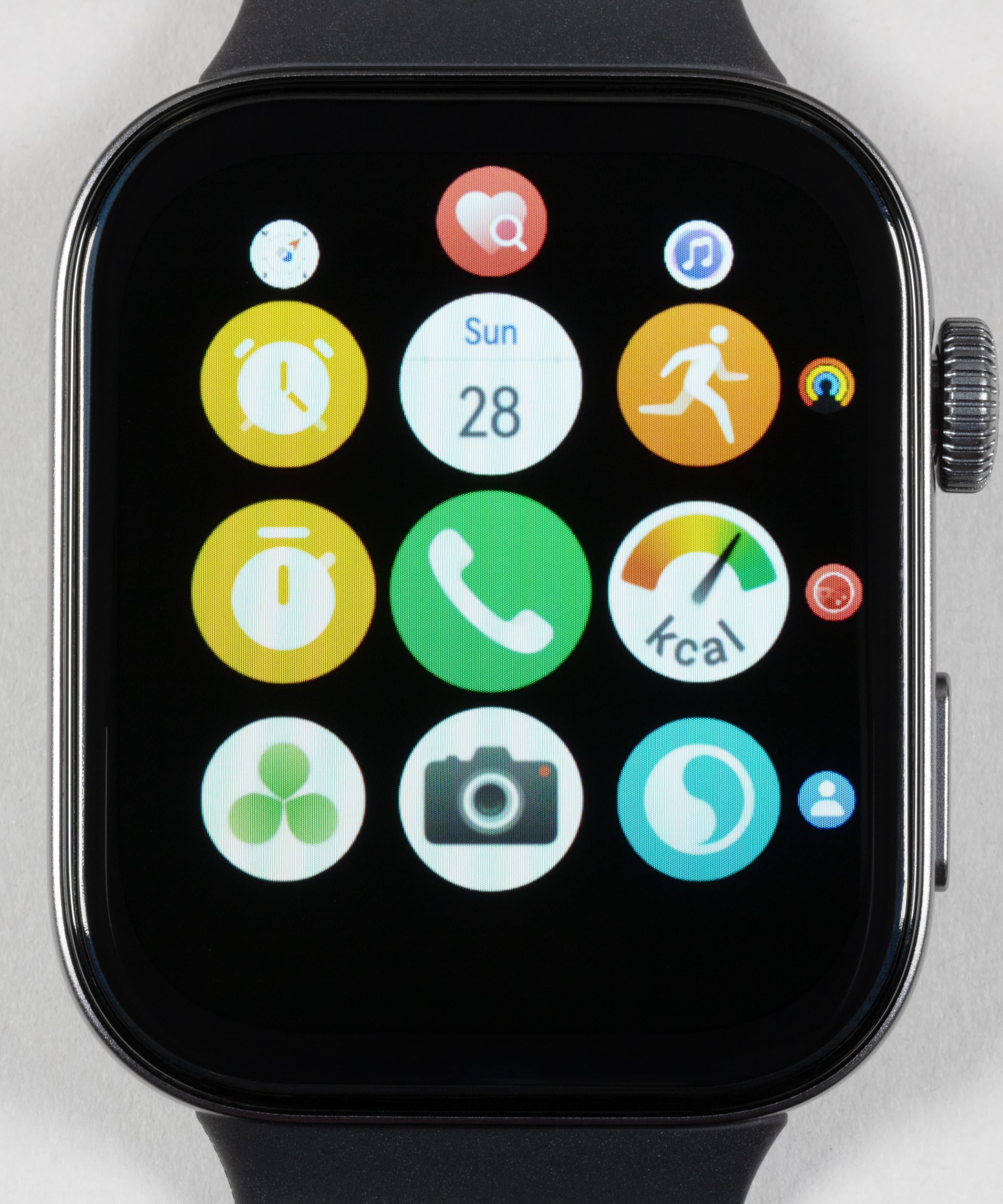 Функциональность кнопок идентична Apple Watch, вплоть до того, что колесико может увеличивать (то есть как бы приближать) иконки приложений в основном меню. Правда, расположены они чуть иначе — рядами, а не скученно, и при приближении под ними появляются названия. Но в целом принцип тот же. Ну а продолговатая кнопка по умолчанию открывает меню тренировок, но здесь её можно перепрограммировать на многие другие задачи.