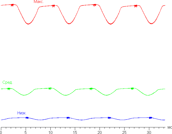 На графике зависимости яркости от времени определяется значимая модуляция с частотой 120 Гц, а при желании на некоторых изображениях при быстром движении часов относительно глаз можно выявить стробоскопический эффект. Однако по факту при обычном использовании мерцание не обнаруживается, так как скважность невысокая и фаза модуляции различается по площади экрана. На рисунке ниже приведены зависимости яркости (вертикальная ось) от времени (горизонтальная ось) для нескольких значений настройки яркости.