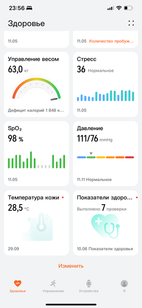 Интерфейс смартфонного приложения мы неоднократно описывали, так что напомним главное. На вкладке «Устройства» мы можем выбрать наши часы, и увидим информацию об оставшемся заряде батареи, получим доступ к циферблатам и основным настройкам (обращаем внимание: ряд медицинских опций надо вручную активировать через мобильное приложение, они будут доступны только после того, как вы передвинете соответствующий рычажок и примете дополнительные пользовательские соглашения). Далее, во вкладке «Здоровье» аккумулируются все сведения о ваших активностях и физических показателях.