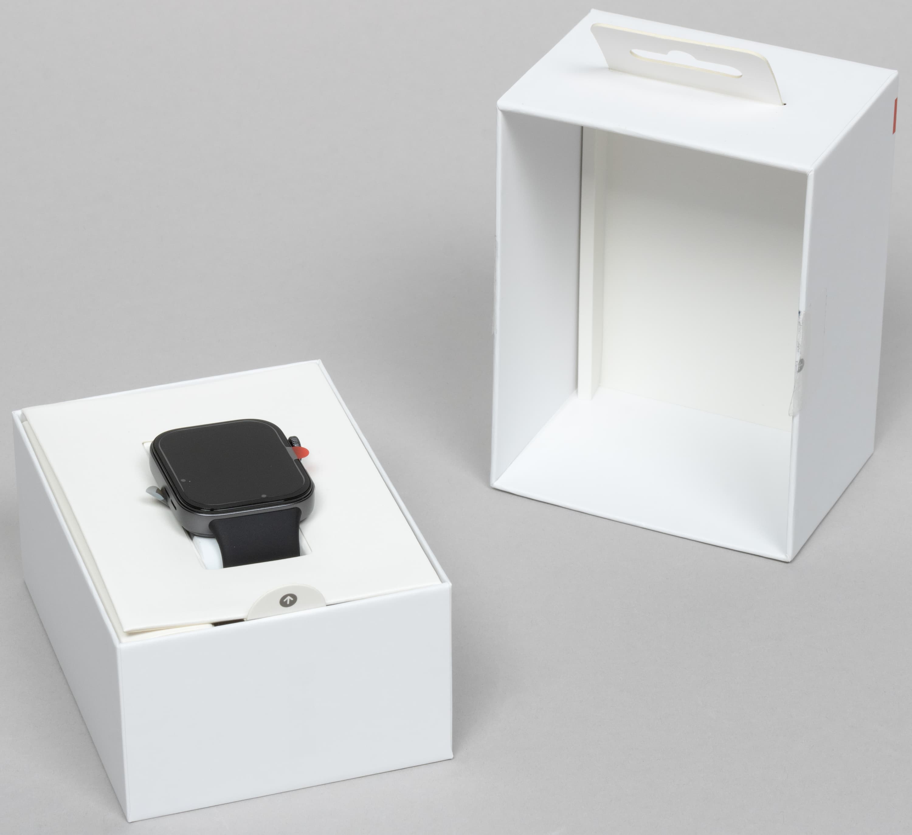 Часы располагаются в картонной прорези, они надеты на мягкий держатель и надежно защищены от возможных ударов при транспортировке.