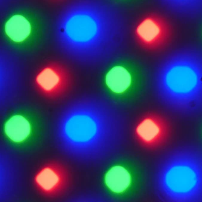 В этом экране используется OLED-матрица — активная матрица на органических светодиодах. Полноцветное изображение создается с помощью субпикселей трех цветов — красного (R), зеленого (G) и синего (B) в равном количестве, что подтверждается фрагментом микрофотографии:
