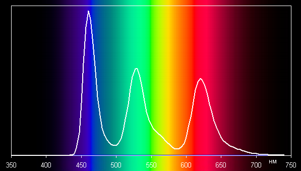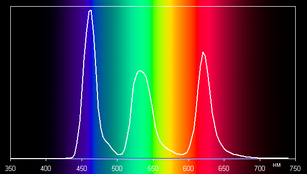 Спектры типичны для OLED — области первичных цветов хорошо разделены и имеют вид относительно узких пиков: