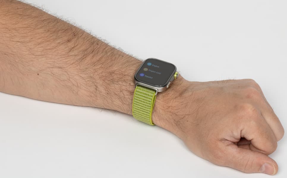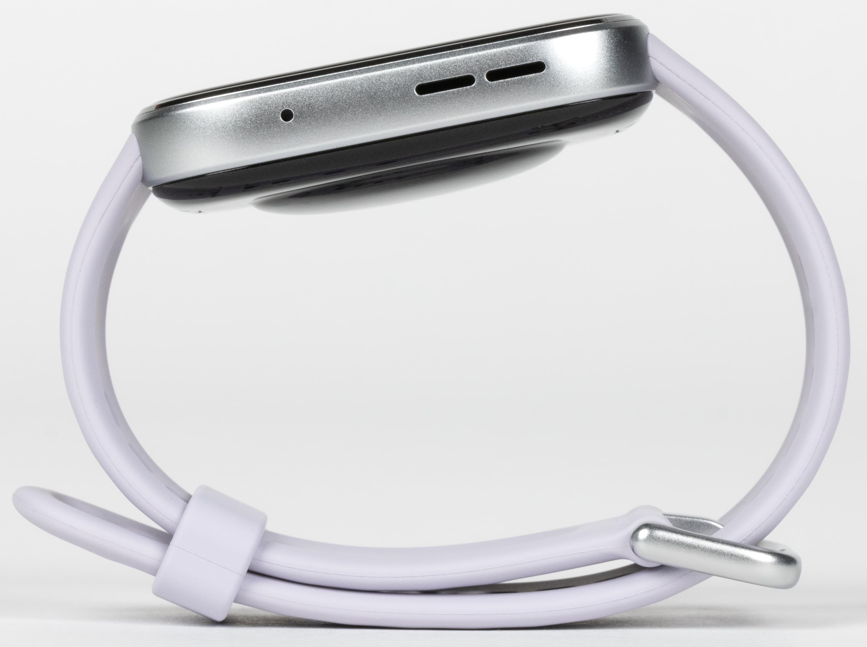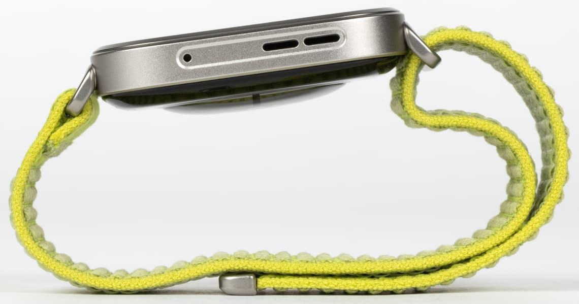 Интересно, что Watch Fit 4 Pro, несмотря на компактность, напоминает своей брутальностью Apple Watch Ultra. Здесь тоже стекло не поднимается над уровнем окантовки, грани не скруглены, ремешок крепится к корпусу выступающими стальными петлями, а обе кнопки имеют ровно такую же форму — разве что они меньше (как и устройство в целом).
