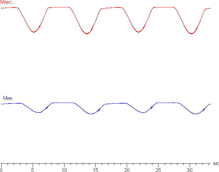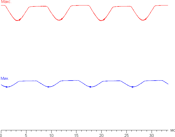На графике зависимости яркости от времени определяется значимая модуляция с частотой 120 Гц, а при желании на некоторых изображениях при быстром движении часов относительно глаз можно выявить стробоскопический эффект. Однако по факту при обычном использовании мерцание не обнаруживается, так как фаза модуляции различается по площади экрана. На рисунках ниже приведены зависимости яркости (вертикальная ось) от времени (горизонтальная ось) для максимального и минимального значения яркости в режиме фонарика. Здесь и далее сначала будет идти изображение, соответствующее обычному Fit 4, а следом — Pro-версии.