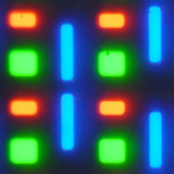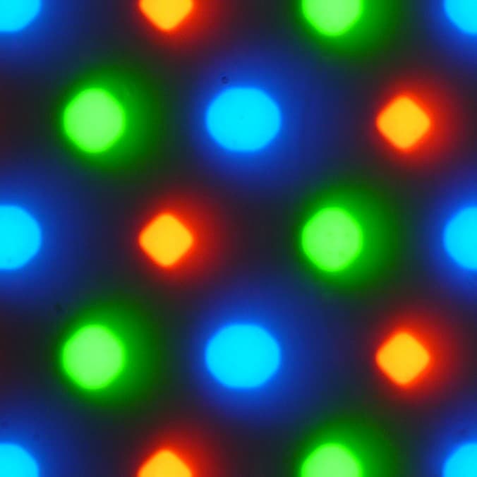 В экранах обеих моделей используется OLED-матрица — активная матрица на органических светодиодах. Полноцветное изображение создается с помощью субпикселей трех цветов — красного (R), зеленого (G) и синего (B) в равном количестве, что подтверждается фрагментом микрофотографии: