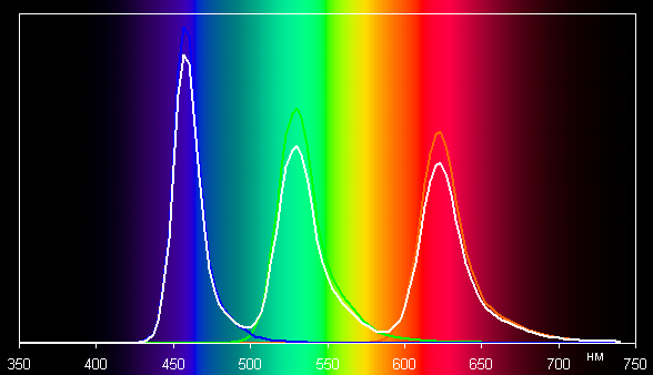 Спектры типичны для OLED — области первичных цветов хорошо разделены и имеют вид относительно узких пиков, перекрестное подмешивание цветов практически отсутствует:
