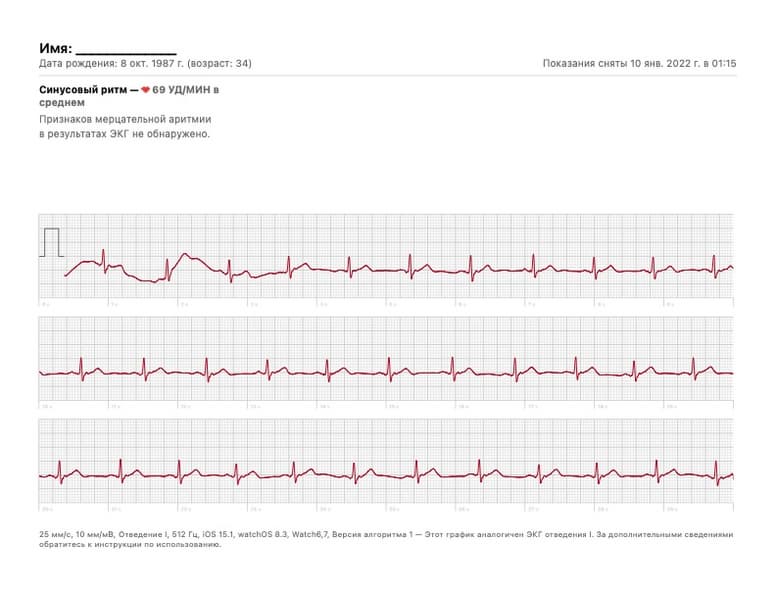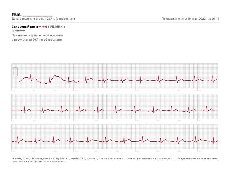 Обратим внимание, что параметры измерения, указанные внизу, идентичны: 1 отведение, скорость записи 25 мм/с, амплитуда 10 мм/мВ. Таким образом, можно сделать вывод, что точность и корректность ЭКГ у Apple Watch Series 7 и Huawei Watch GT 3 Pro идентична.