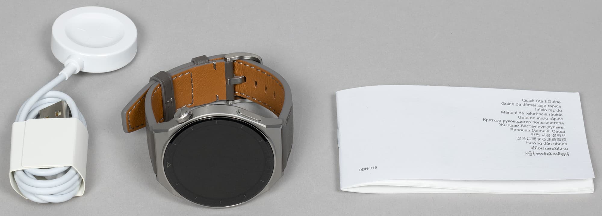 Нет отличий от Watch 3 GT и в комплектации. Кроме самого устройства в коробке располагается маленький буклет «Краткое руководство пользователя» и беспроводная зарядка с USB-А на конце провода.