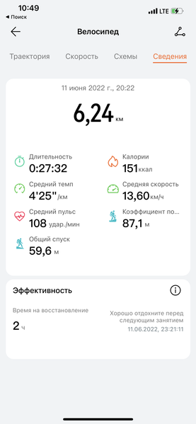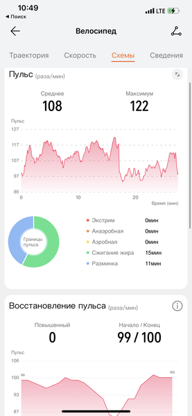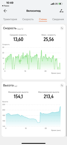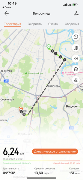 Далее, Watch GT 3 Pro — один из лучших вариантов для непрофессиональных занятий спортом. Здесь есть GPS, часы довольно точно отслеживают тренировки, в частности на свежем воздухе, и обладают полноценной влагозащитой для плавания в бассейнах/водоемах. В летний сезон это особенно актуально. Ниже — скриншоты поездки на велосипеде. Пунктирной линией обозначена пауза — в этот момент автор ехал на электричке.