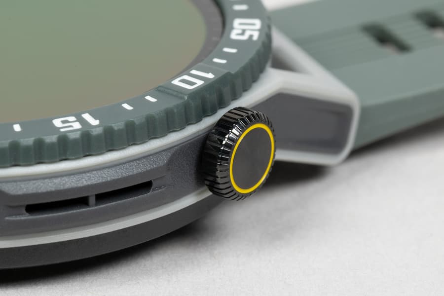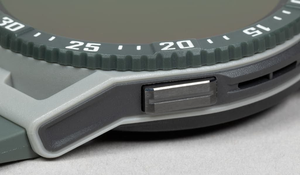 Корпус часов полностью выполнен из пластика (сообщается, что это «прочные полимерные материалы»), из металла — только кнопки. Экран же утоплен в корпус и окружен высоким неподвижным безелем с насечками по краю.