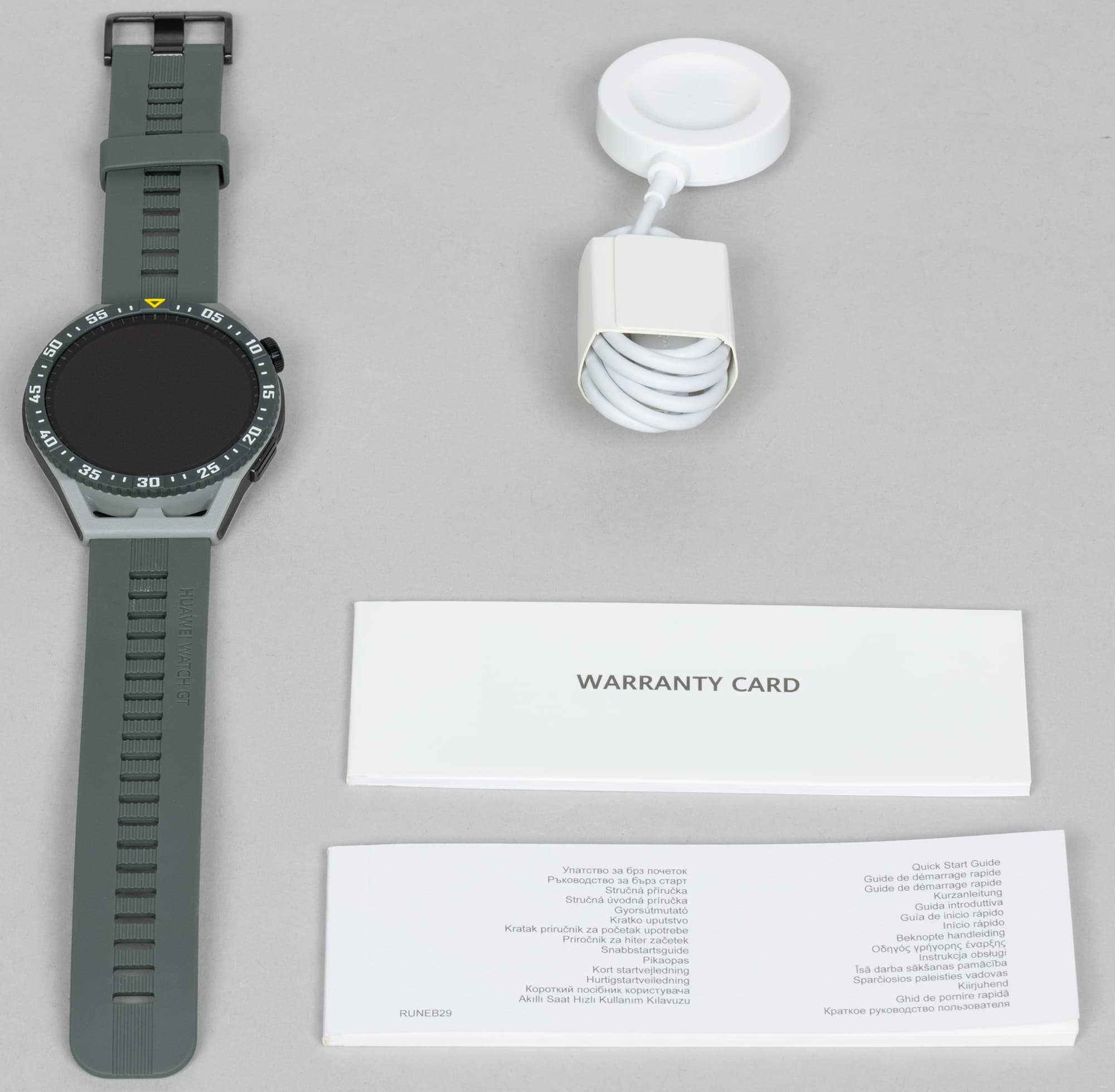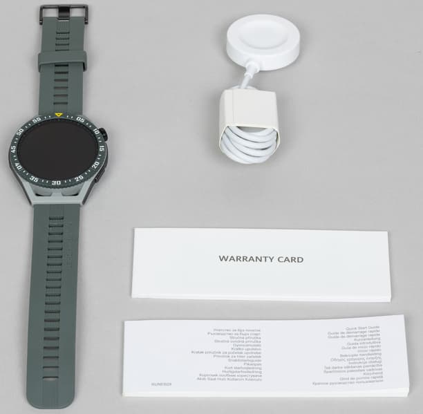 Часы поставляются в продолговатой картонной коробке, которая выглядит проще, чем у Huawei Watch GT 3 / GT 3 Pro, у которых была явная претензия на то, что это дорогие, отнюдь не бюджетные устройства.