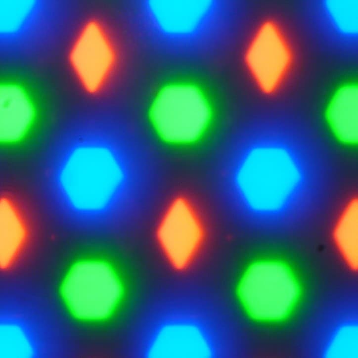 В этом экране используется OLED-матрица — активная матрица на органических светодиодах. Полноцветное изображение создается с помощью субпикселей трех цветов — красного (R), зеленого (G) и синего (B) в равном количестве, что подтверждается фрагментом микрофотографии: