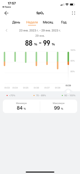 Разумеется, часы могут в фоновом режиме отслеживать и насыщенность крови кислородом (SpO2), но здесь у нас есть вопросы. Дело в том, что в норме этот показатель должен составлять 95%—98%. Всё, что ниже 95% — уже тревожный звонок. Ну а ниже 90% — это человек должен лежать на искусственной вентиляции легких. Скриншоты ниже, однако, показывают, что неоднократно в процессе измерения часы фиксировали значения ниже 90% (хотя автор при этом был вполне здоров и не страдал в обозримом прошлом никакими пневмониями. Проще говоря, точность здесь оставляет желать лучшего и всерьез полагаться на результаты (например, во время заболевания ковидом) нельзя.