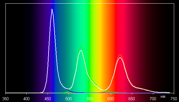 Спектры типичны для OLED — области первичных цветов хорошо разделены и имеют вид относительно узких пиков, перекрестное подмешивание цветов практически отсутствует: