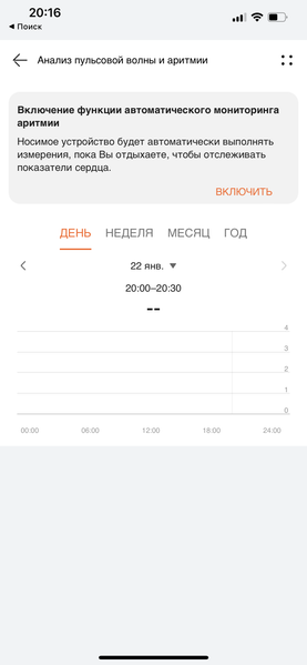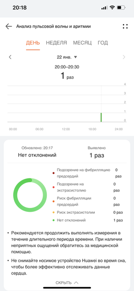 В процессе тестирования за неделю ношения часов у автора было три таких уведомления, одно из которых поступило после раннего утреннего пробуждения. По информации в самом приложении, недостаток сна, усталость и прочие факторы действительно могут стать причиной таких случаев, и это не является отклонением от нормы, а лишь сигналом, что надо немного последить за своим режимом. Можно измерить пульсовую волну и вручную — как через смартфонное приложение, так и напрямую из меню в часах. Процесс занимает 45 секунд (плюс еще около 5 секунд на подготовку).