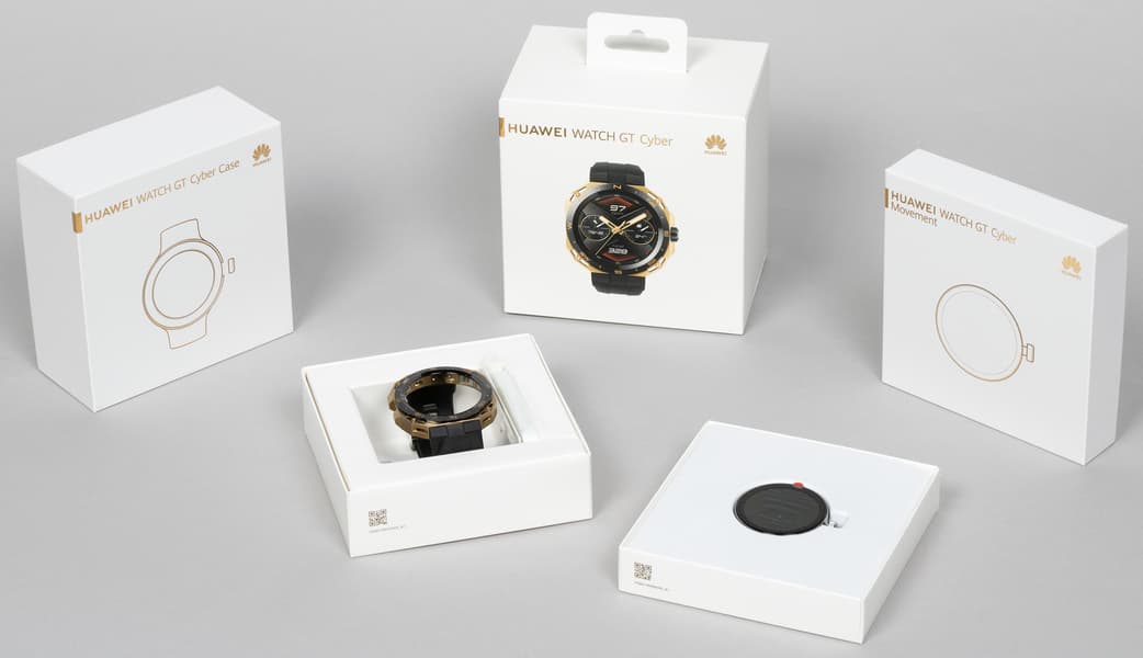 Внешне коробка Watch GT Cyber похожа на упаковку предыдущих моделей линейки Watch GT: очень плотный картонный бокс квадратной формы, умеренно минималистичный дизайн.