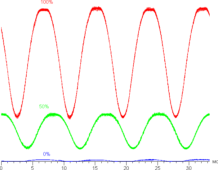 На графике зависимости яркости от времени определяется значимая модуляция с частотой 118 Гц, а при желании на некоторых изображениях при быстром движении часов относительно глаз можно выявить стробоскопических эффект. Однако по факту при обычном использовании мерцание не обнаруживается, так как фаза модуляции различается по площади экрана. На рисунке ниже приведены зависимости яркости (вертикальная ось) от времени (горизонтальная ось) для нескольких значений настройки яркости.