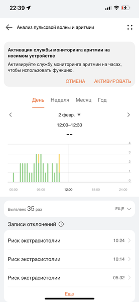 Зато здесь есть анализ пульсовой волны, о котором мы говорили в связи с Huawei Watch GT 3 SE. Напомним, при активации этого режима часы автоматически фиксируют сердцебиение и определяют, нет ли признаков аритмии (в частности — экстрасистолии, то есть нарушения сердечного ритма, характеризующегося внеочередными сокращениями всего сердца или его отдельных частей). В случае обнаружения внеочередных сокращений часы посылают уведомление о риске экстрасистолии, а в приложении затем можно посмотреть, когда именно они наблюдались.