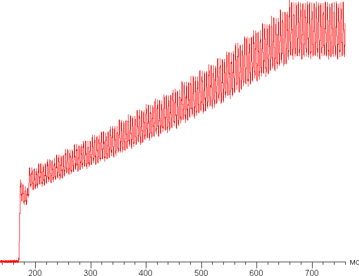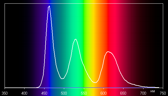 Спектр белого типичен для OLED — области первичных цветов хорошо разделены и имеют вид относительно узких пиков: