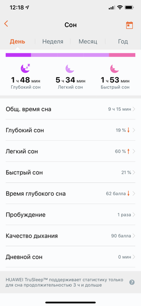 Сон, в отличие от тренировок, отслеживается автоматически. Вы просто ложитесь спать в часах, а когда пробуждаетесь — синхронизируете часы со смартфоном и видите всю информацию о вашем сне.