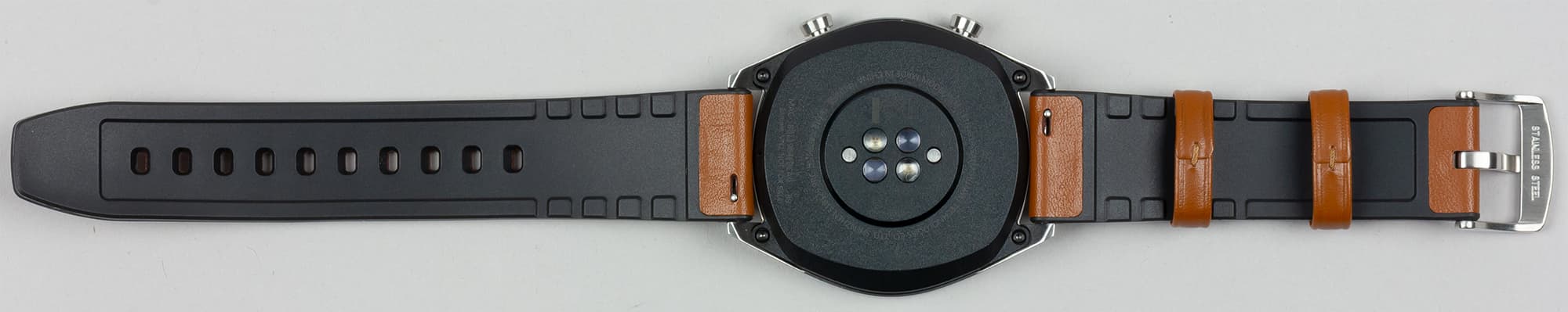 Но если мы перевернем ремешок, то увидим черный силикон, а не кожу. Проще говоря, ремешок двухслойный: наружная поверхность — кожаная, внутренняя, прилегающая к руке — силиконовая. Края тоже силиконовые. Хорошо это или плохо? У такого решения есть как плюсы, так и минусы.